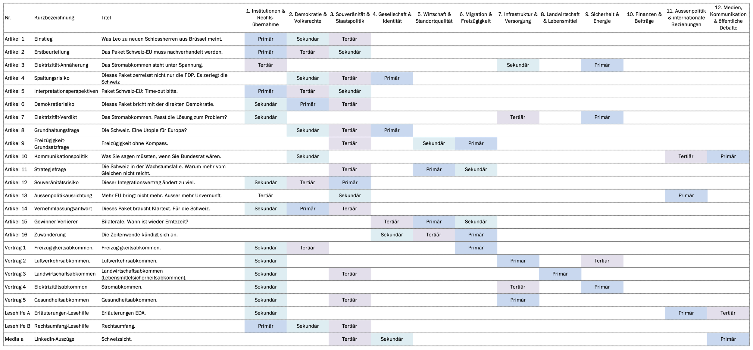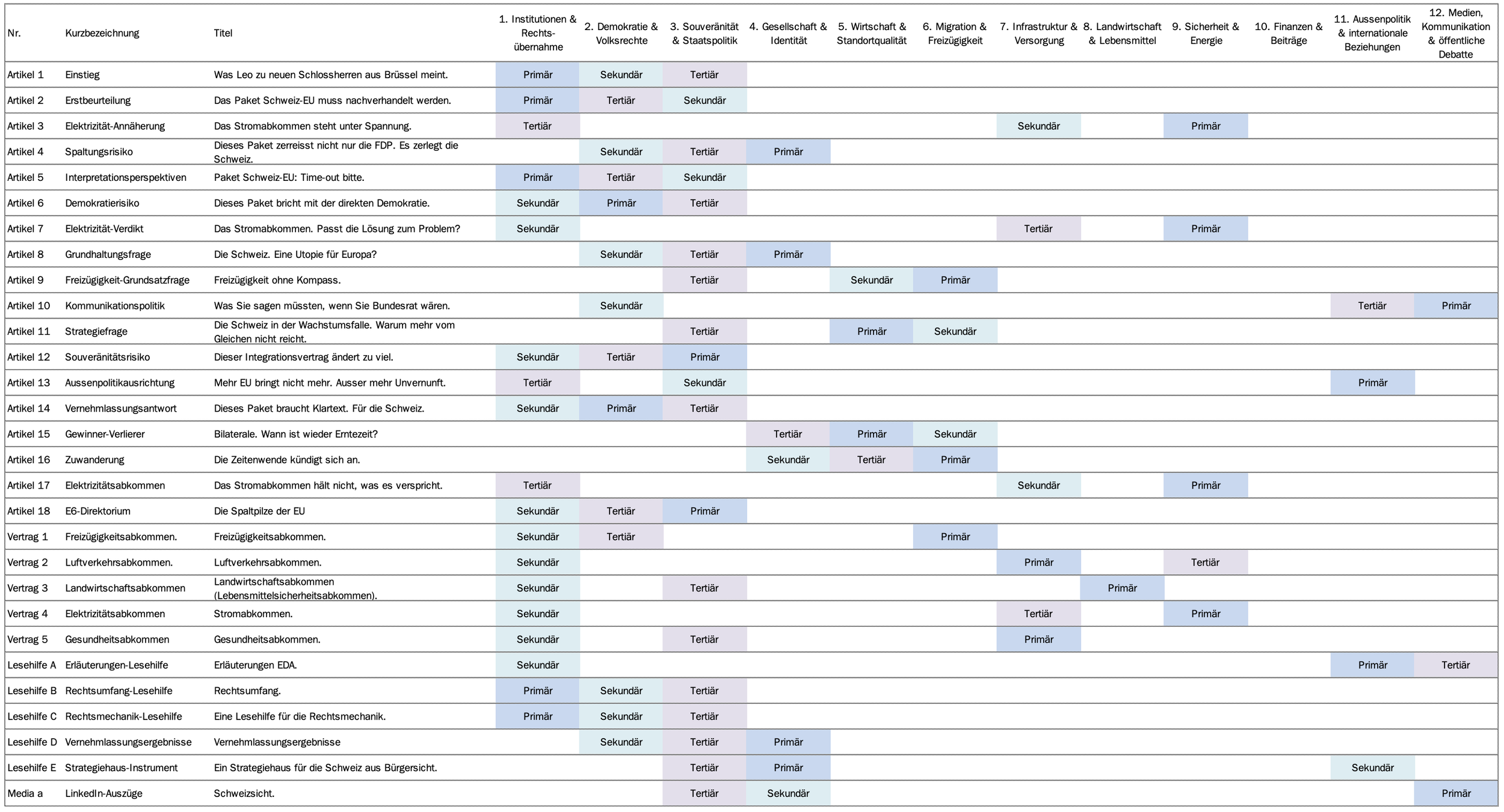 Übersicht der Kernhandlungsfelder der Schweiz und ihre Zuordnung der Texte in diese Rubriken.