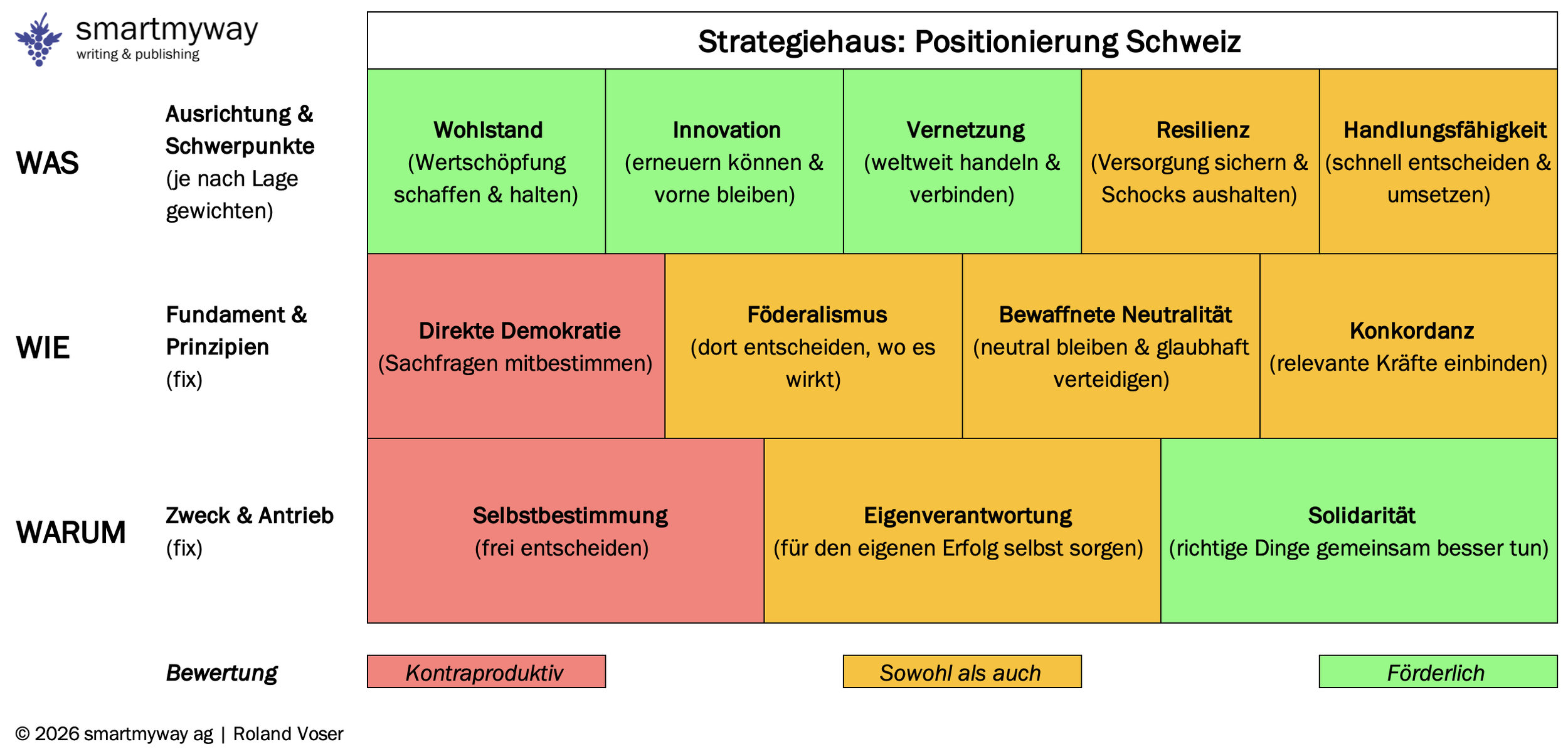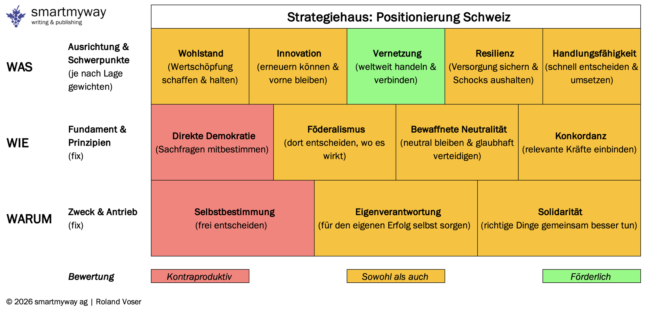 Damit liegt die strategische Bruchlinie nicht bei der Frage pro oder contra Europa, sondern bei der Abwägung zwischen besserer Vernetzung und institutioneller Selbststeuerung. Ein starkes WAS kann die roten Felder im Fundament und beim Zweck («Purpose») nicht kompensieren.