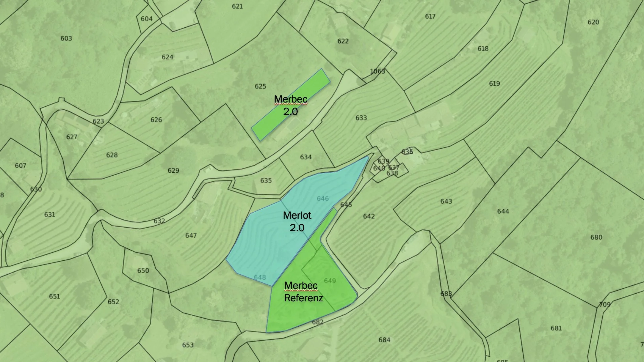 Dazu besteht ein klassisch bewirtschafteter Referenzweinberg mit rund 200 Pflanzen, aus dem ein Merbec (70 % Merlot, 30 % Malbec) gekeltert wird (Cademario, Parzellen 646, 648, 649). Dieser Wein dient als sensorischer und qualitativer Benchmark und wird weiterhin konventionell bewirtschaftet.